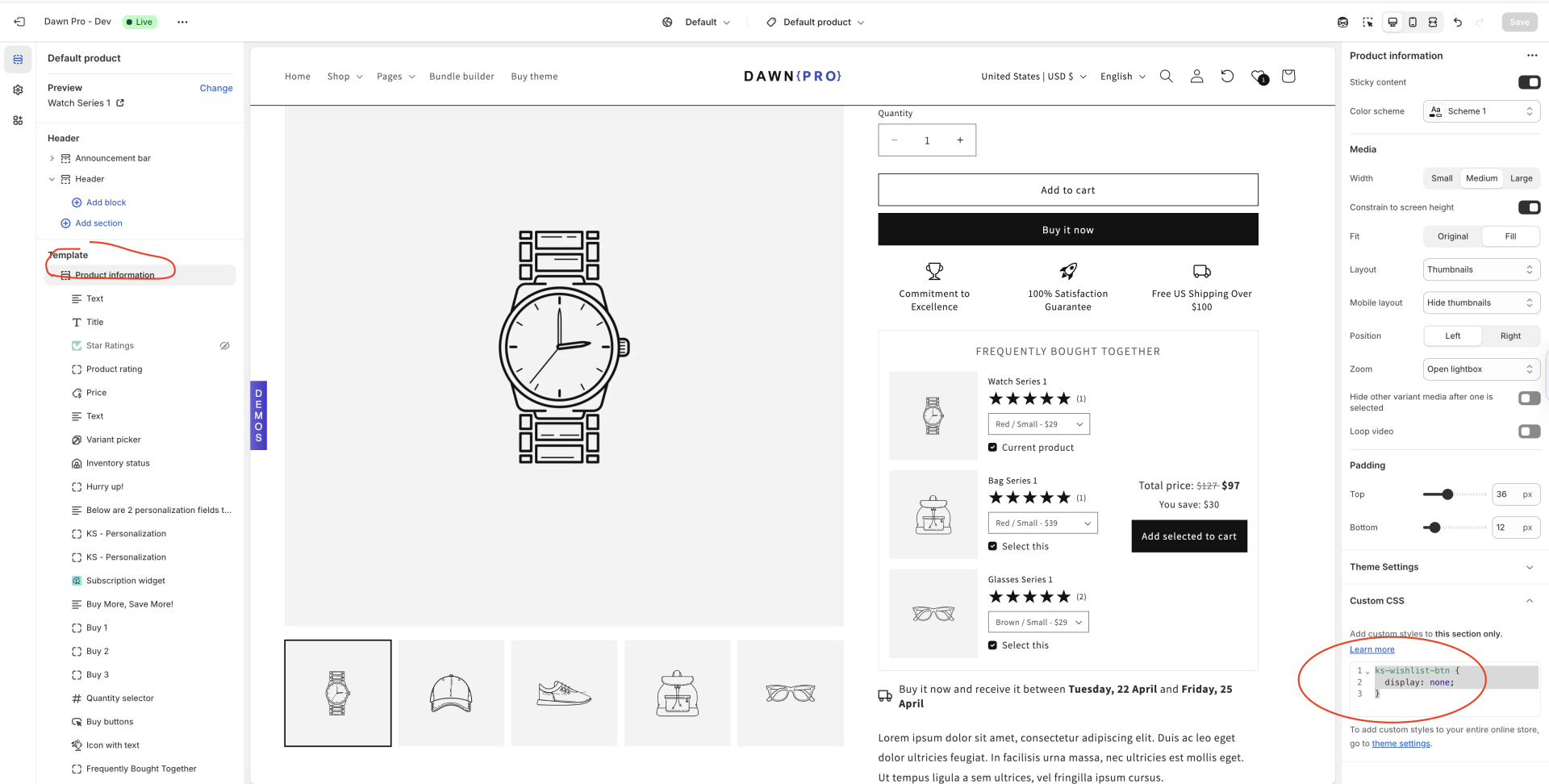 You can put that CSS code in the "Custom CSS" setting within the "Product Information" section.